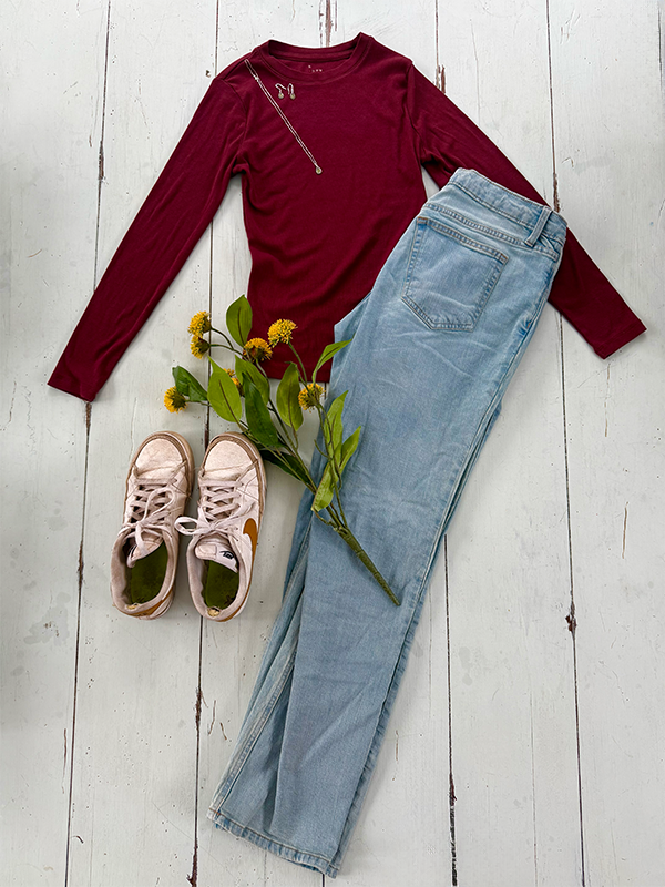 A cozy, everyday outfit bundle with a burgundy top, jeans, sneakers, and sentimental jewelry accents.