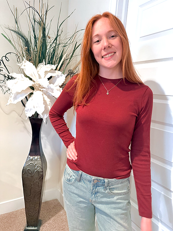 This outfit set brings together pieces that carry both style and story. The deep burgundy top and darker-toned accessories were chosen to complement a range of skin tones, creating a look that feels naturally flattering and grounded. Paired with classic jeans and shoes worn since high school, the outfit has a relaxed, lived-in feel that blends comfort with personal meaning. Every element works together to create a casual look that feels authentic, confident, and effortlessly put together.
