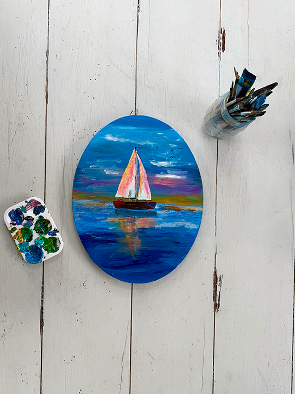 When I painted this sailboat last year, it honestly just started as a random idea on a quiet afternoon. I didn’t plan anything serious. I just grabbed some paint, put on some music, and let myself mess around with colors until the whole scene started to feel calm and kind of daydreamy. The little sailboat ended up drifting across this mix of soft blues and warm sky tones, and even though it was simple, it felt like one of those pieces you make just because it feels good in the moment.